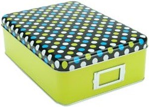 This tin box was specifically sized to be useful and portable! Store scrapbooking and card making embellishments, photos, and much more in this handy and attractive tin. This package contains 1 tin box with a removable lid measuring 3-1/4" x 7" x 9-7/8". Features a metal label holder and comes in Pink (black with hot pink, purple & white) and Green (black with blue, green & white), each sold separately.